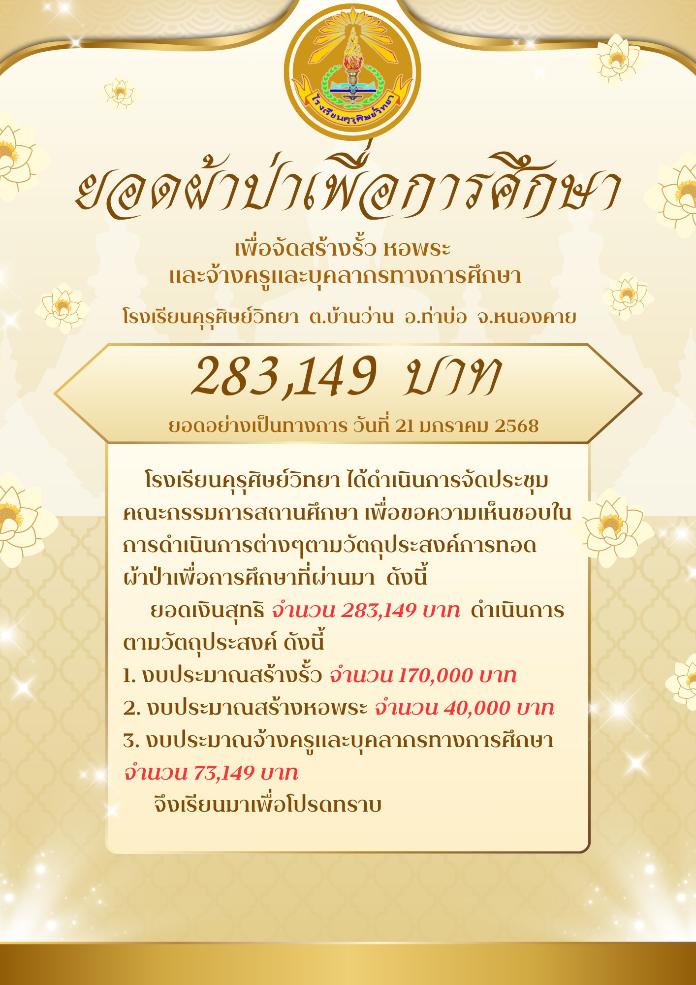 แจ้งยอดผ้าป่าเพื่อการศึกษาจัดสร้างรั้ว สร้าหอพระ และจ้างครูบุคลากรทางการศึกษา โรงเรียนคุรุศิษย์วิทยา ยอดอย่างเป็นทางการ ณ วันที่ 21 มกราคม 2568